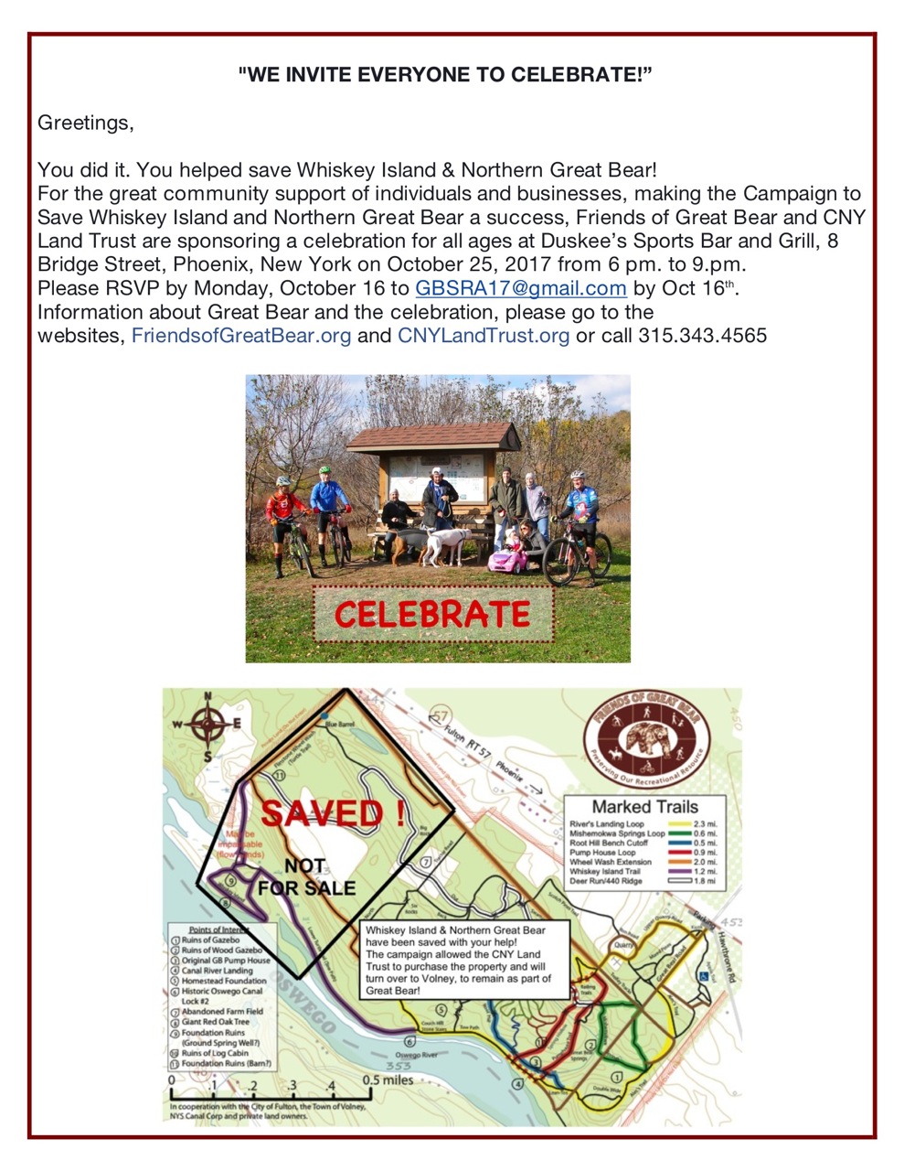 We are pleased to announce the success of our campaign. We invite you all to our celebration in saving this special land parcel for Great Bear Springs Recreation Area.