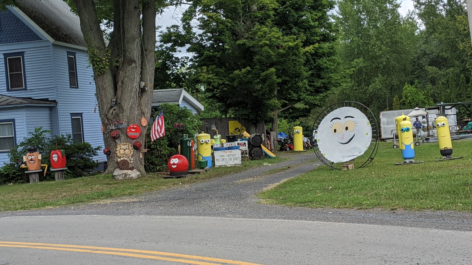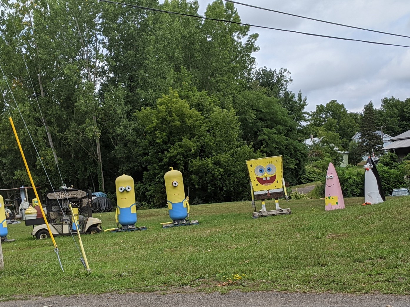 Twelve members rode today from Fulton on the Chimney Bluffs Route. Most did the 44 mile option, two did 69 that went to Lake Ontario and the bluffs. The ride was mainly on rolling country roads with very little traffic. There was much to see – corn fields, apple orchards, cows, horses, lots of geese, deer, a goat, a coyote (so I’m told) and some Minions (I couldn’t get them all in one picture). Overall it seemed like the approval rating of this ride was high. And the weather cooperated – cloudy this morning, but as promised, sun this afternoon.
