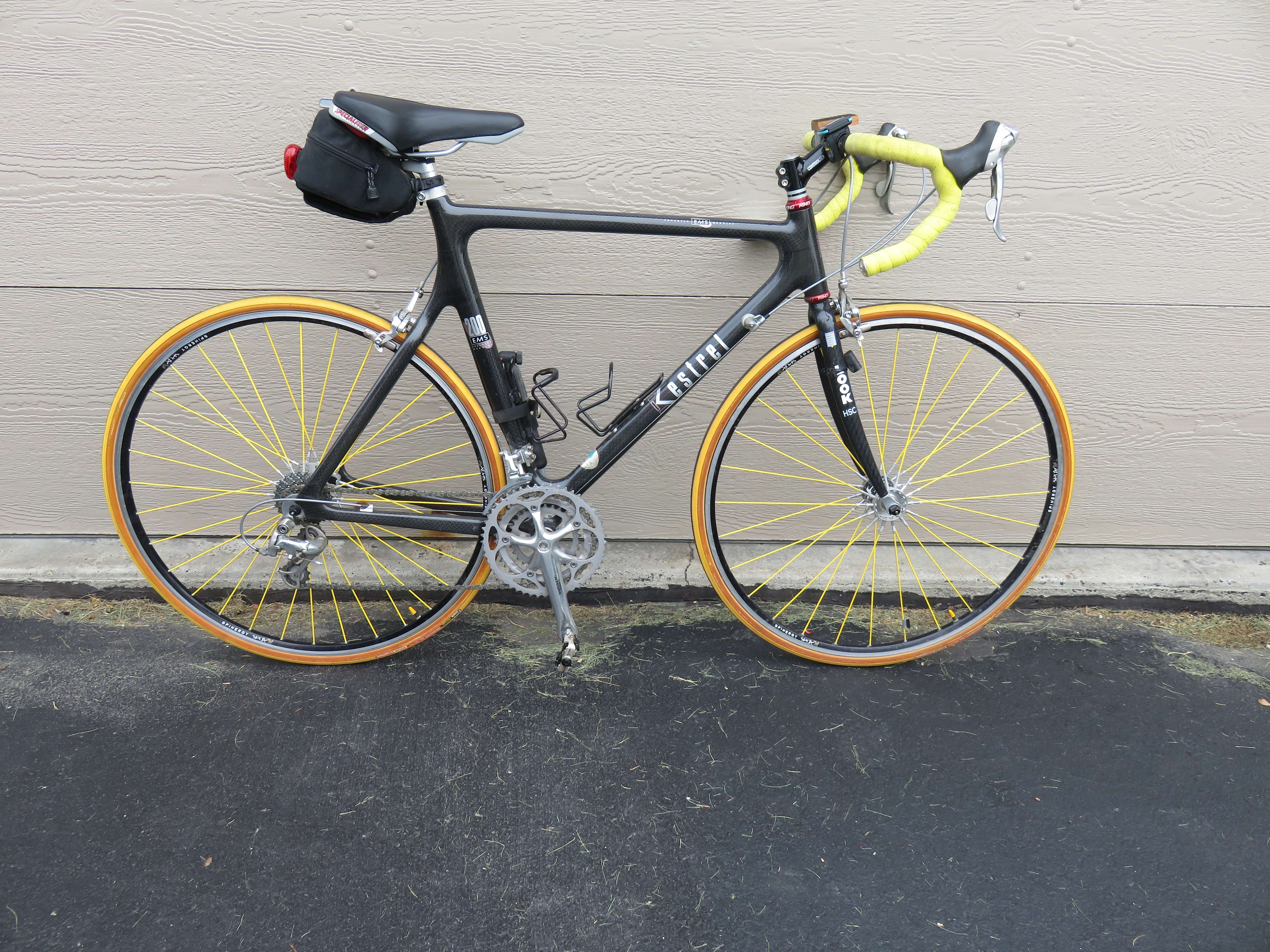 Classic 1997 Kestrel Carbon Fiber, Black, Natural Weave,  Clear Coat finish.  Ultegra components,9 speed with triple chain ring.  Seldom used, gently ridden and well cared for.  A prized possession but my neighbor’s knee injury limited his usage.  Many miles remain.  Yellow spokes and yellow bar tape plus: